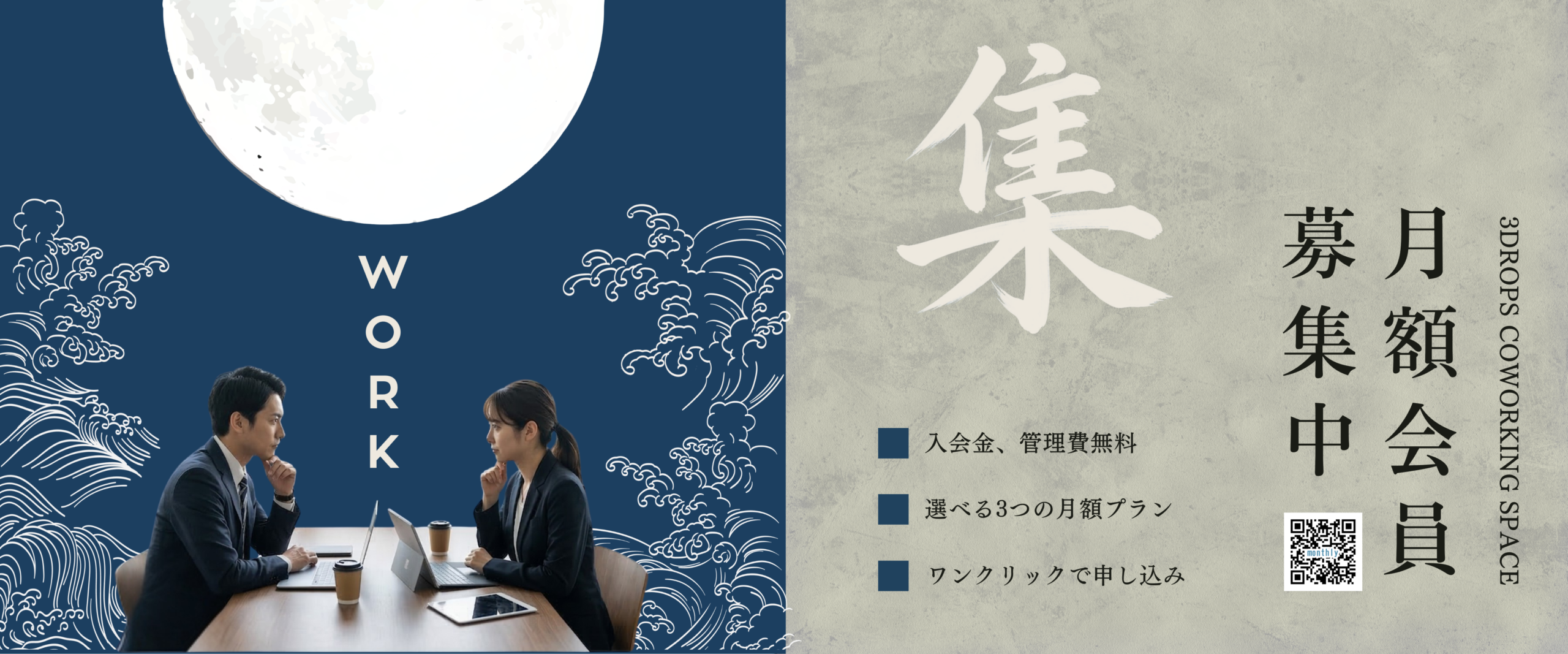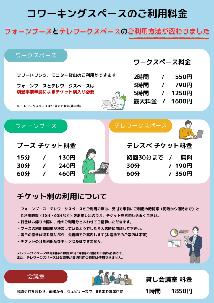 ・開放的なコワーキングスペースは予約や入会金(登録)が不要のドロップイン形式(時間料金制)です。